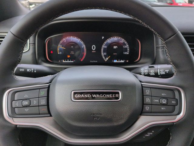 Quick Order Package 29E Grand Wagoneer, 118 MPH Maximum Speed Calibration, 3.55 Rear Axle Ratio, 3rd row seats: bench, 4-Wheel Disc Brakes, 9 Speakers, ABS brakes, Air Conditioning, Alloy wheels, AM/FM radio: SiriusXM with 360L, Anti-whiplash front head restraints, Apple CarPlay/Android Auto, Audio memory, Auto Adjust in Reverse Exterior Mirrors, Auto High-beam Headlights, Auto-dimming door mirrors, Auto-Dimming Exterior Driver Mirror, Auto-dimming Rear-View mirror, Auto-leveling suspension, Automatic temperature control, Brake assist, Bumpers: body-color, Compass, Delay-off headlights, Driver door bin, Driver vanity mirror, Driver's Seat Mounted Armrest, Dual front impact airbags, Dual front side impact airbags, Electronic Stability Control, Emergency communication system: Jeep Connect, Exterior Mirrors Approach Lamps, Exterior Mirrors w/Memory, Exterior Mirrors w/Supplemental Signals, Exterior Parking Camera Rear, Four wheel independent suspension, Front anti-roll bar, Front Bucket Seats, Front Center Armrest w/Storage, Front dual zone A/C, Front fog lights, Front reading lights, Fully automatic headlights, Garage door transmitter, Heated door mirrors, Heated Exterior Mirrors, Heated front seats, Heated steering wheel, Illuminated entry, Knee airbag, Leather Trimmed Bucket Seats, Low tire pressure warning, Memory seat, Navigation System, Normal Duty Suspension, Occupant sensing airbag, Outside temperature display, Overhead airbag, Overhead console, Panic alarm, Passenger door bin, Passenger seat mounted armrest, Passenger vanity mirror, Power door mirrors, Power driver seat, Power Liftgate, Power passenger seat, Power steering, Power windows, Radio data system, Radio: Uconnect 5 Nav w/12.0" Display, Rain sensing wipers, Rear air conditioning, Rear anti-roll bar, Rear reading lights, Rear seat center armrest, Rear window defroster, Rear window wiper, Reclining 3rd row seat, Remote keyless entry, Security system, Speed control, Speed-sensing steering, Speed-Sensitive Wipers, Split folding rear seat, Steering wheel memory, Steering wheel mounted audio controls, Tachometer, Telescoping steering wheel, Tilt steering wheel, Traction control, Trip computer, Turn signal indicator mirrors, Variably intermittent wipers, Ventilated front seats, Voltmeter, and Wheels: 20" x 9" Machine Face Painted Aluminum.
