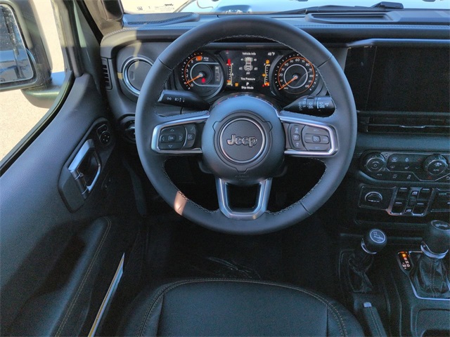 Quick Order Package 24G, Sahara Popular Equipment Group (12.3" Touchscreen Display, 4G LTE Wi-Fi Hot Spot, Alpine Premium Audio System, Apple CarPlay, Auto High Beam Headlamp Control, Auto-Dimming Rear-View Mirror, Blind Spot & Cross Path Detection, Connected Travel & Traffic Services, Connectivity - US/Canada, For More Info, Call 800-643-2112, Google Android Auto, GPS Navigation, Hard Seat Back, HD Radio, Integrated Center Stack Radio, Integrated Off-Road Camera, Integrated Voice Command w/Bluetooth, Leather Wrapped Park Brake Handle, Leather Wrapped Shift Knob, McKinley Trimmed Seats, ParkSense Rear Park Assist System, Power 4-Way Driver Lumbar Adjust, Power 4-Way Passenger Lumbar Adjust, Power Adjust 8-Way Driver Seat, Power Adjust 8-Way Front Passenger Seat, Radio: Uconnect 5 Nav w/12.3" Display, Side Steps, SiriusXM Radio Service, SiriusXM w/360L, and Universal Garage Door Opener), 3.45 Overall Top Gear Ratio, 4-Wheel Disc Brakes, 8 Speakers, ABS brakes, Air Conditioning, Alloy wheels, AM/FM radio: SiriusXM with 360L, Apple CarPlay/Android Auto, Automatic temperature control, Aux Battery, Brake assist, Cloth Low-Back Bucket Seats, Compass, Delay-off headlights, Driver door bin, Driver vanity mirror, Dual front impact airbags, Dual front side impact airbags, Electronic Stability Control, Emergency communication system: Jeep Connect, Front anti-roll bar, Front Bucket Seats, Front Center Armrest w/Storage, Front dual zone A/C, Front fog lights, Front reading lights, Fully automatic headlights, Heated door mirrors, Heated front seats, Heated steering wheel, Heavy Duty Suspension w/Gas Shocks, Illuminated entry, Integrated roll-over protection, Low tire pressure warning, MOPAR All-Weather Floor Mats, Non-Lock Fuel Cap w/o Discriminator, Occupant sensing airbag, Outside temperature display, Overhead airbag, Panic alarm, ParkView Rear Back-Up Camera, Passenger door bin, Passenger vanity mirror, Power door mirrors, Power steering, Power Top Quarter Window Storage Bag, Power windows, Radio data system, Radio: Uconnect 5 w/12.3" Display, Rear anti-roll bar, Rear reading lights, Rear Window Defroster, Rear Window Wiper/Washer, Remote keyless entry, Removable Rear Quarter Windows, Security system, Sky One-Touch Power Top, Speed control, Split folding rear seat, Steering wheel mounted audio controls, Stop-Start Dual Battery System, Tachometer, Telescoping steering wheel, Tilt steering wheel, Traction control, Trip computer, Variably intermittent wipers, Voltmeter, and Wheels: 18" x 7.5" Machine/Painted Gray.