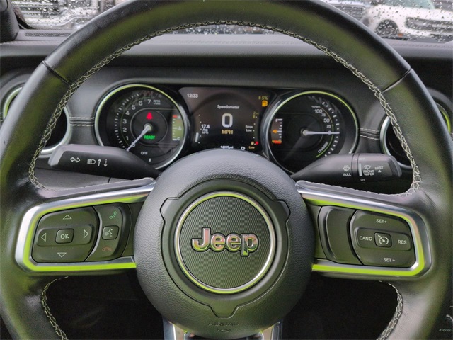 This 2021 Jeep Wrangler Unlimited Sahara 4xe in Black Clearcoat features: 4D Sport Utility, 2.0L I4 DOHC, 8-Speed Automatic, 4WD, 4-Wheel Disc Brakes, ABS brakes, Alloy wheels, AM/FM radio, Android Auto, Apple Carplay, Apple CarPlay/Android Auto, Auto LED Headlights, Auto-dimming Rear-View mirror, Backup Camera, Bluetooth w/ Audio Streaming, Cold Weather Package, Compass, Delay-off headlights, Emergency communication system: SiriusXM Guardian, Front Center Armrest w/Storage, Front dual zone A/C, Garage door transmitter, Heated door mirrors, Hill Start Assist, Illuminated entry, Integrated roll-over protection, Leather Seats, Leather Shift Knob, Leather steering wheel, Leather Trimmed Seats w/Sahara Logo, Leather Wrapped Park Brake Handle, Low tire pressure warning, Navigation System, Outside temperature display, Panic alarm, ParkView Rear Back-Up Camera, Passenger door bin, Power door mirrors, Power Mirror Package, Power Package, Power steering, Power windows, Premium Audio Package, Premium Sound Package, Quick Order Package 29P, Radio data system, Radio: Uconnect 4C Nav w/8.4" Display, Rear seat center armrest, Remote keyless entry, Remote Start, Security system, Sport Suspension, Steering wheel mounted audio controls, Telescoping steering wheel, Tilt steering wheel, Traction control, Trip computer, Variably intermittent wipers, Wheels: 20" x 8" Fully Painted Aluminum.