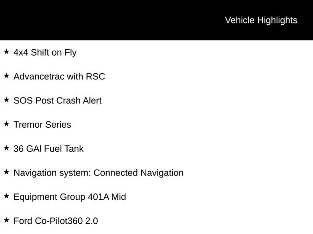 This F-150 Tremor also comes equipped with a host of premium features, including Dual Zone Electronic Automatic Temperature Control, Power Glass Heated Sideview Mirrors, Auto-Dimming Rearview Mirror, Heated Front Seats, and much more. The Ford Co-Pilot360 2.0 suite of advanced driver-assistance technologies provides added peace of mind on the road.