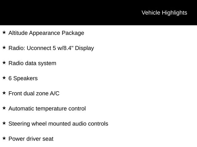 This 2023 Jeep Grand Cherokee Altitude in Diamond Black Crystal Pearlcoat features: 4D Sport Utility, 3.6L V6 24V VVT, 8-Speed Automatic, RWD, 10.25" Color Touchscreen, 115V Auxiliary Power Outlet, 4-Wheel Disc Brakes, 6 Speakers, ABS brakes, Adaptive Cruise Control, Altitude Appearance Package, Android Auto, Apple Carplay, Auto LED Headlights, Automatic temperature control, Backup Camera, Black Headliner, Blind Spot Monitoring, Bluetooth w/ Audio Streaming, Brake assist, Capri Leatherette/Suede Seats, Cold Weather Package, Compass, Delay-off headlights, Delete Laredo Badge, Electronic Stability Control, Emergency communication system, Four wheel independent suspension, Front dual zone A/C, Front Pedestrian Braking, Full Speed Auto Collision Warning Plus, Fully automatic headlights, Gloss Black Exterior Accents, Heated door mirrors, Heated Front Seats, Heated Steering Wheel, Illuminated entry, Lane Keeping System, Low tire pressure warning, Molded In Color Black/Gloss Black Roof Rails, Outside temperature display, Overhead console, Panic alarm, Parking Sensors, ParkView Rear Back-Up Camera, Power door mirrors, Power driver seat, Power Liftgate, Power Mirror Package, Power Package, Power steering, Power windows, Preferred Equipment Package, Push Button Start, Quick Order Package 23B Altitude, Radio data system, Radio: Uconnect 5 w/8.4" Display, Rain Sensitive Windshield Wipers, Rear Cross Traffic Alert, Rear window wiper, Remote keyless entry, Remote Start, Remote Start System, Reverse Brake Assist, Reverse Sensing, Safety Package, Security system, Selectable Tire Fill Alert, Speed-Sensitive Wipers, Split folding rear seat, Spoiler, Steering wheel mounted audio controls, Sunroof/Moonroof, Telescoping steering wheel, Tilt steering wheel, Traction control, Trip computer, Wheels: 20" x 8.5" Gloss Black Painted Aluminum, Wireless Charging Pad.